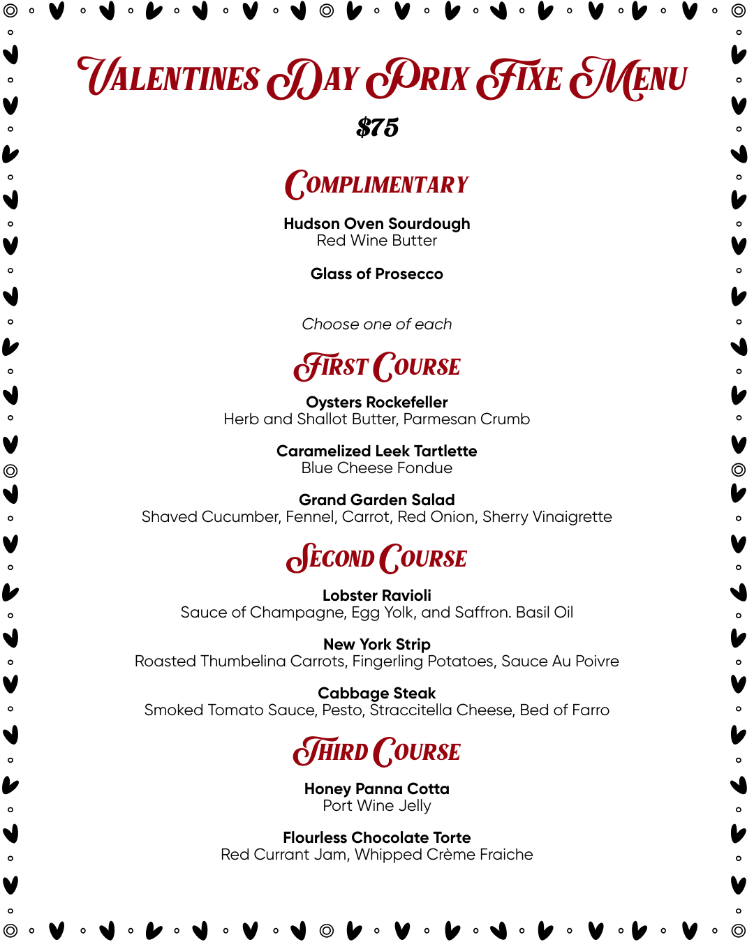 $75 prix fixe menu (below) from Chef Nick, plus couples-themed drink specials.